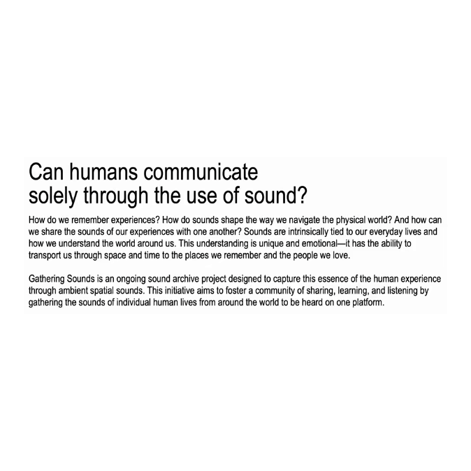 Gathering sounds is on going sound archival project designed to capture an integral, but often overlooked essence of the human experience. The Gathering Sounds website allows users create 'mix-tapes' by dragging and dropping sound bytes, personally recorded and collected, onto the disc. After 'burning' the disc, it is added to a collection of other mixtapes from people around the world to be listen to.